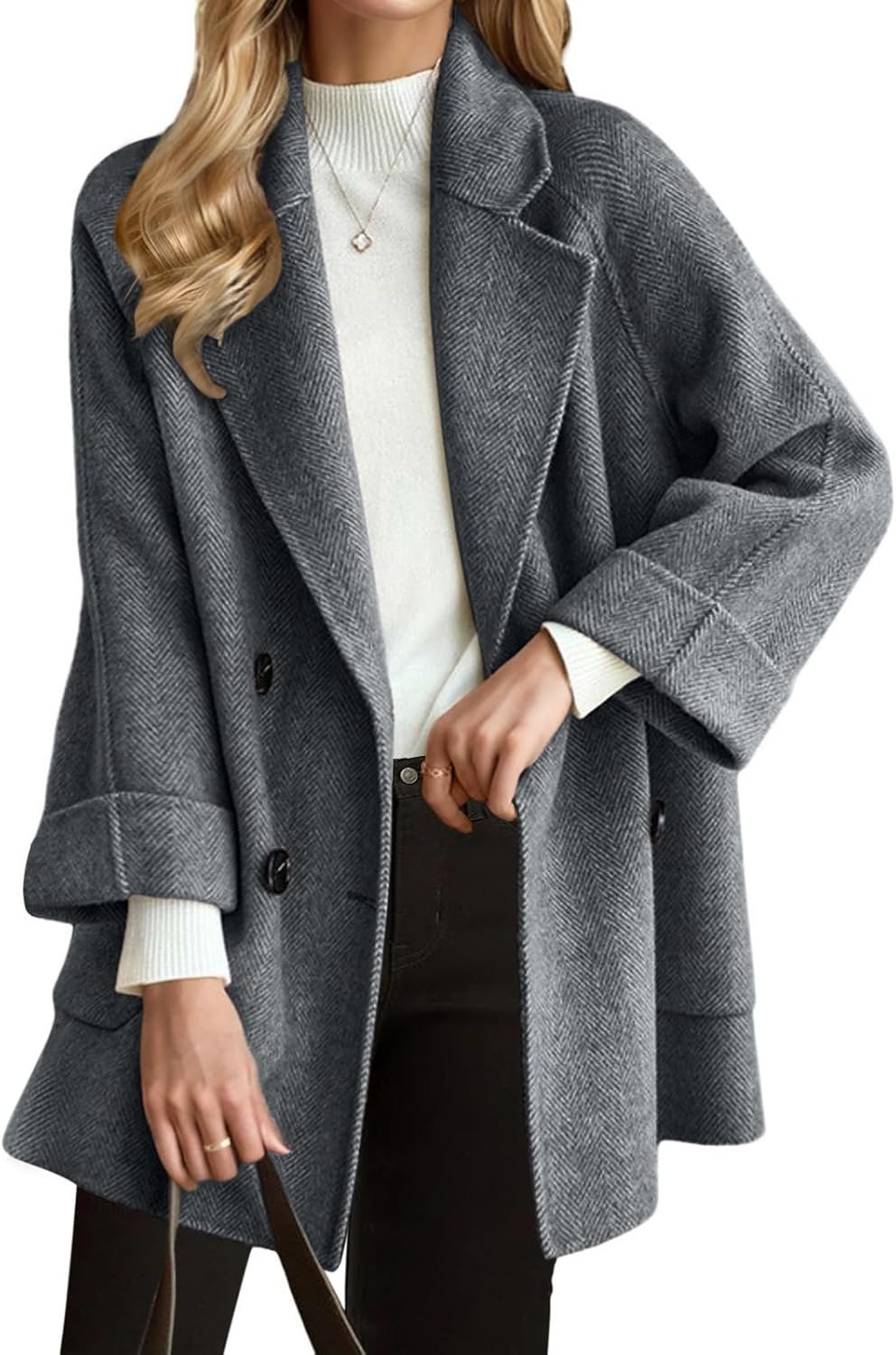 About this item Midi long wool blend pea coat with pockets, featuring herringbone stripe pattern & double breasted 2 button placket, notched collar, v-neck, long sleeve with tapered cuff, above knee length Elegant winter trench coat in relaxed fit, made of windproof and high quality woollen blend fabric, classic herringbone never out of date, 5 […]